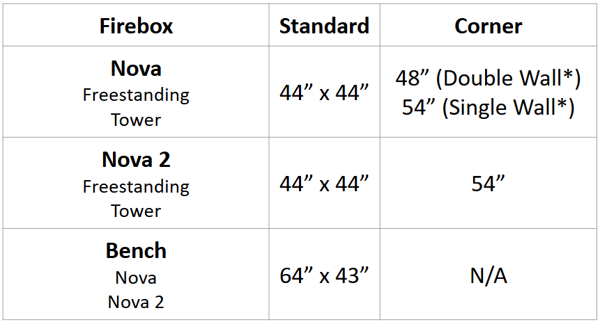 *Using single or double wall stove pipe affects which size corner hearth pad can be used with Nova